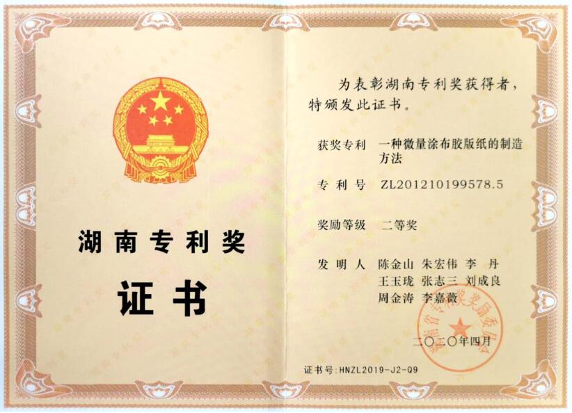 2019年度湖南专利奖在2020年湖南知识产权宣传周启动仪式上揭晓,瑞福尼科技公司喜获专利发明二等奖,获奖专利为“一种微量涂布胶版纸的制造方法”。该专利技术生产的高档文化纸系列产品以环保的生物机械浆为主要原料,并采用了先进的高档微量涂布技术,具有白度高,松厚性好、平滑细腻、印刷适性好、绿色环保等优势。专利技术在岳阳林纸股份公司成功实施3年以来,共创效超过6000余万元,环境效益和社会效益显著。