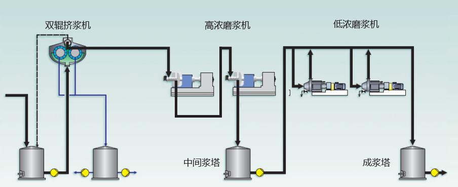 2)高浓磨浆设备,包括高浓磨浆机,专利磨片,浆料输送及浓缩设备等
